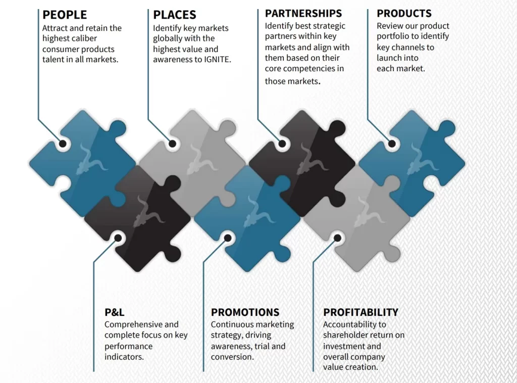 A global lifestyle brand unlike any other, IGNITE combines premium quality ingredients with an unprecedented level of ambition, innovation and an uncompromised standard of excellence. IGNITE has positioned itself as the gold standard and industry expert in Nicotine, Spirits, and supported with a premium apparel line for an active lifestyle. IGNITE is a socially responsible company dedicated to leveraging its marketing and brand power to promote a healthy lifestyle. The IGNITE management team believes that these initiatives positively impact the company, its employees, and its shareholders.